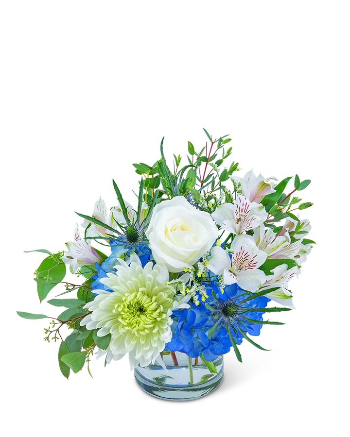 The crisp blues and whites of this bouquet are reminiscent of a bright sunny day. Roses, alstroemeria, hydrangeas, cremon mums, eryngium, and limonium are combined to create Azure Horizon. It's perfect for a new baby, get well, or just because gift.