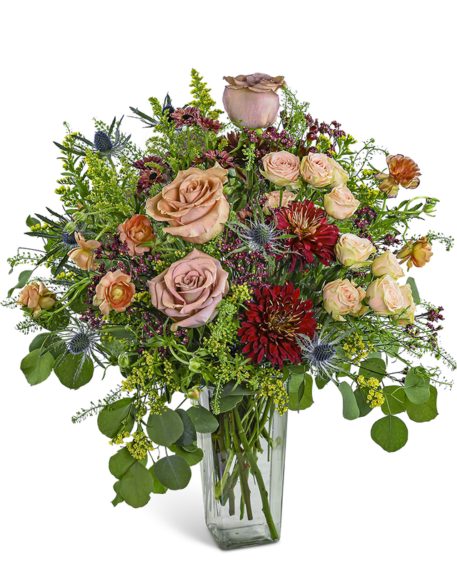 Chestnut Orchard is a graceful arrangement featuring soft neutral Roses, Berries, Thistle, and seasonal accent blooms in warm autumn tones. Designed in a clear glass vase, it's perfect for birthdays, anniversaries, or thoughtful flower delivery just because. Our local florist may make tasteful substitutions to ensure freshness and maintain the beauty of the design.