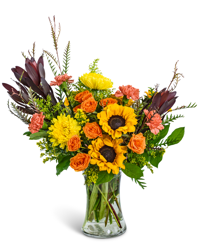 Golden Saffron is a vibrant arrangement of Sunflowers, Roses, Carnations, Cremon, Solidago, and Leucadendron in a classic clear glass vase. Its sunny palette and rich texture make it perfect for celebrations or brightening any day. Thoughtful substitutions may be made by our floral designer to maintain the overall look and feel.