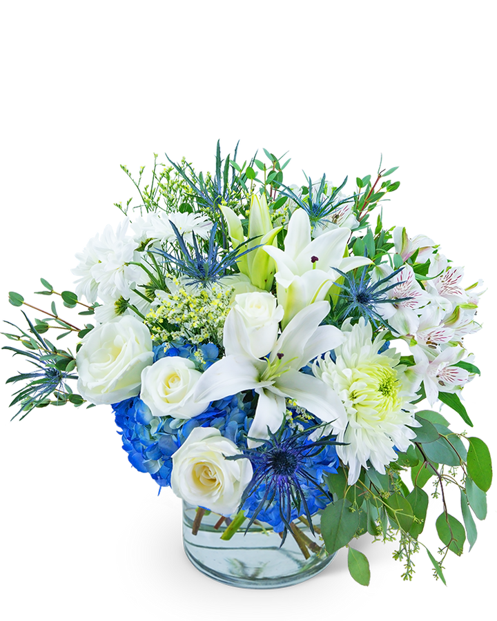 The crisp blues and whites of this bouquet are reminiscent of a bright sunny day. Roses, alstroemeria, hydrangeas, mums, Oriental lilies, eryngium, and limonium are combined to create Peaceful Horizon. It's perfect for a birthday, anniversary, or congratulations gift.